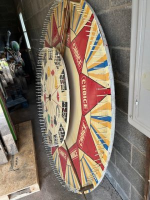 Fantastic 6 foot vintage Seaside Heights New Jersey boardwalk double arrow game of chance wheel in as found condition. Double wheels are hard to find complete, as most times the smaller arrow has been removed. A new smaller arrow will need to be made or an original one secured to make the wheel complete, otherwise the wheel shows some minor wear from years of boardwalk use. A true treasure from the old Seaside Heights days………………