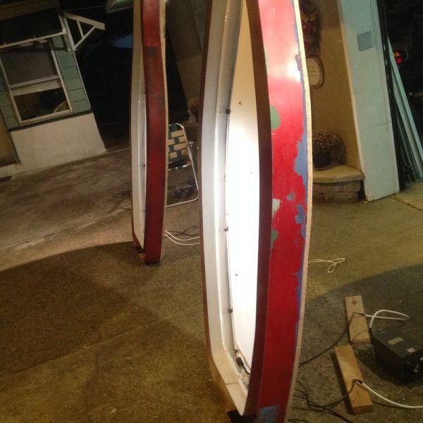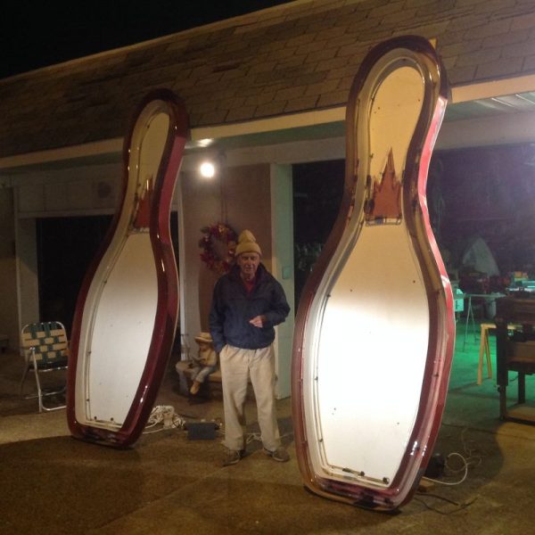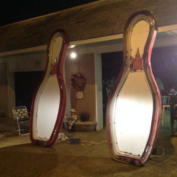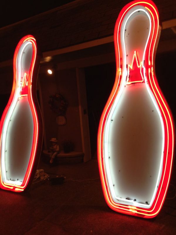 Vintage Mid-Century Neon Bowling Alley Pin Signs Vintage mid century neon bowling alley pin signs in working condition, measuring almost 10′ tall. Pins come complete with transformers. Beautiful red and white neon. Would like to sell as a set but will consider selling separately……..